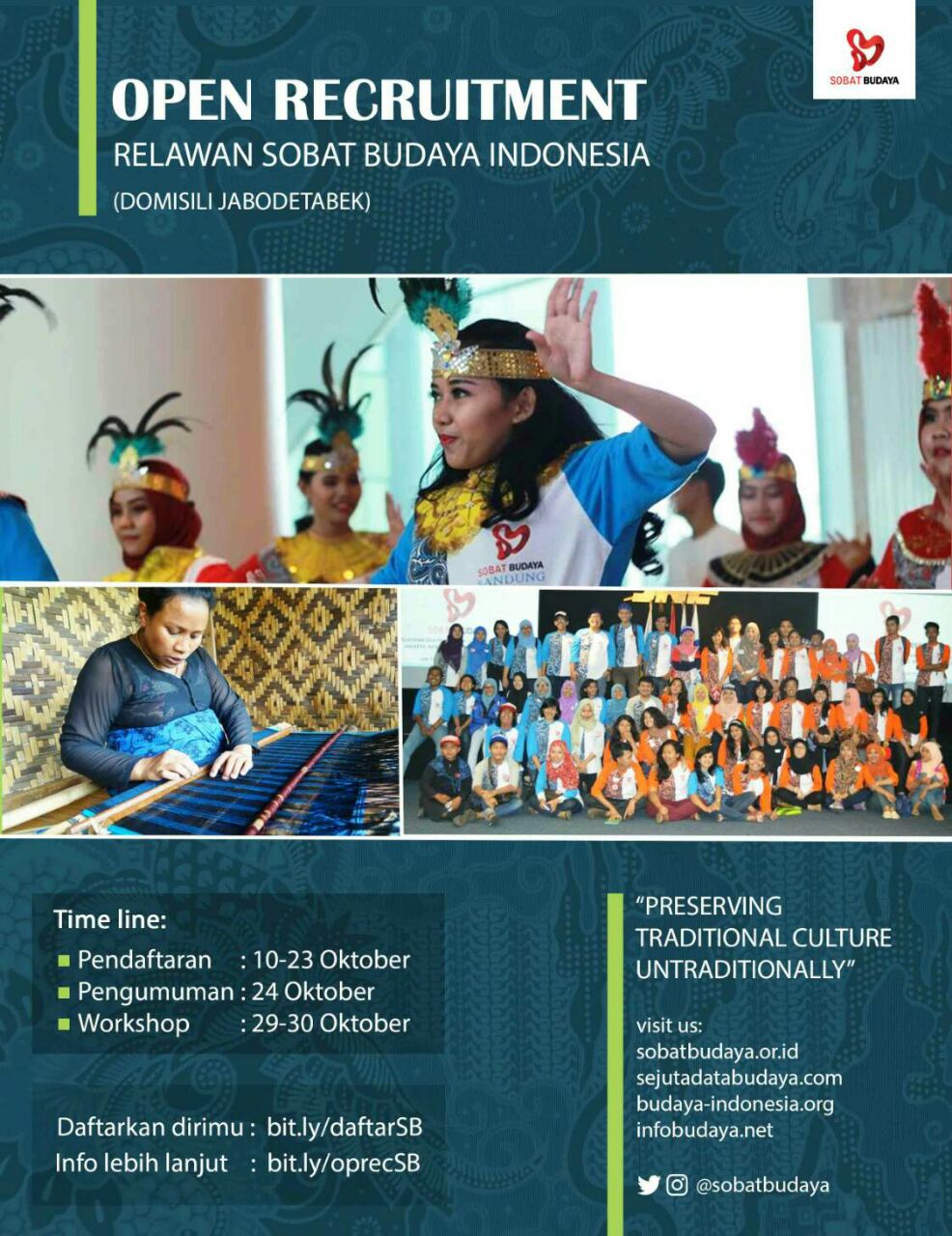 Dalam rangka menyebarkan semangat pendataan budaya Indonesia Sobat Budaya membuka open recruitment relawan untuk mengkampanyekan Gerakan Sejuta Data Budaya dan terus mendata kekayaan budaya tradisi Indonesia.